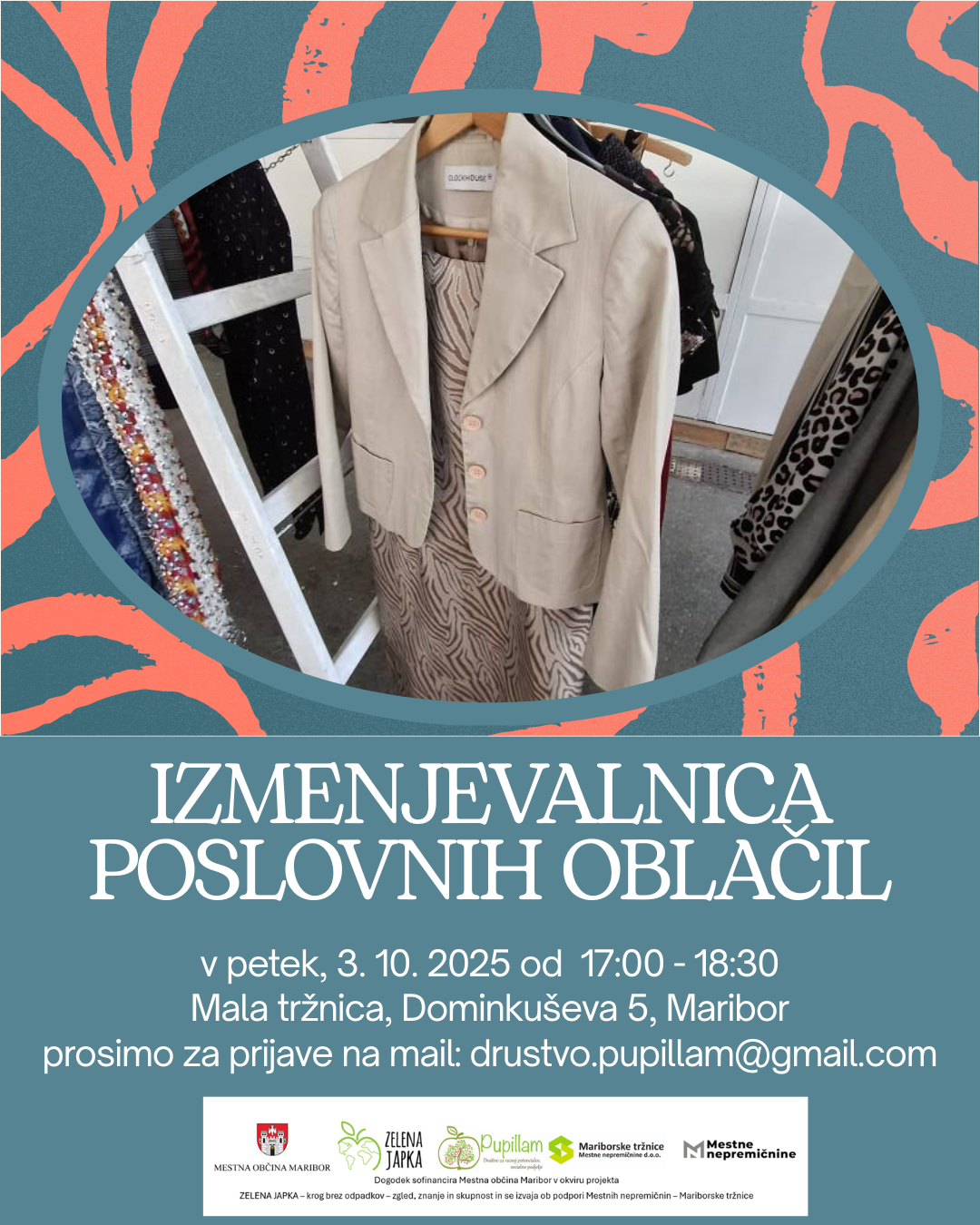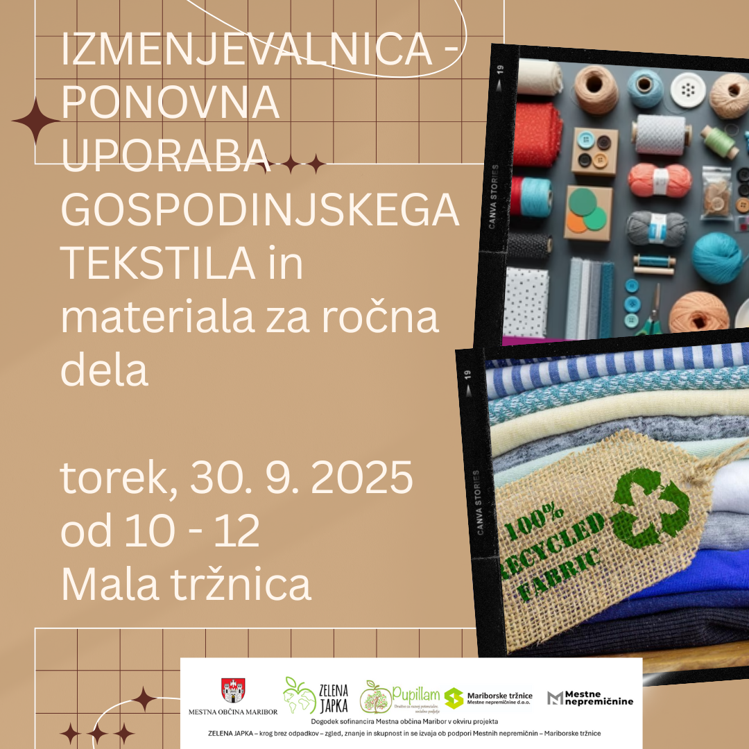30. 9. 10.00 - 12.00 | Mala tržnica, Dominkuševa 5 | Izmenjevalnica - ponovna uporaba gospodinjskega tekstila in materiala za ročna dela | Društvo Pupillam |