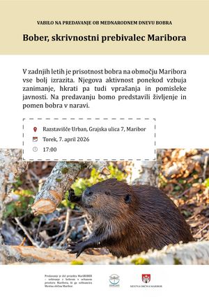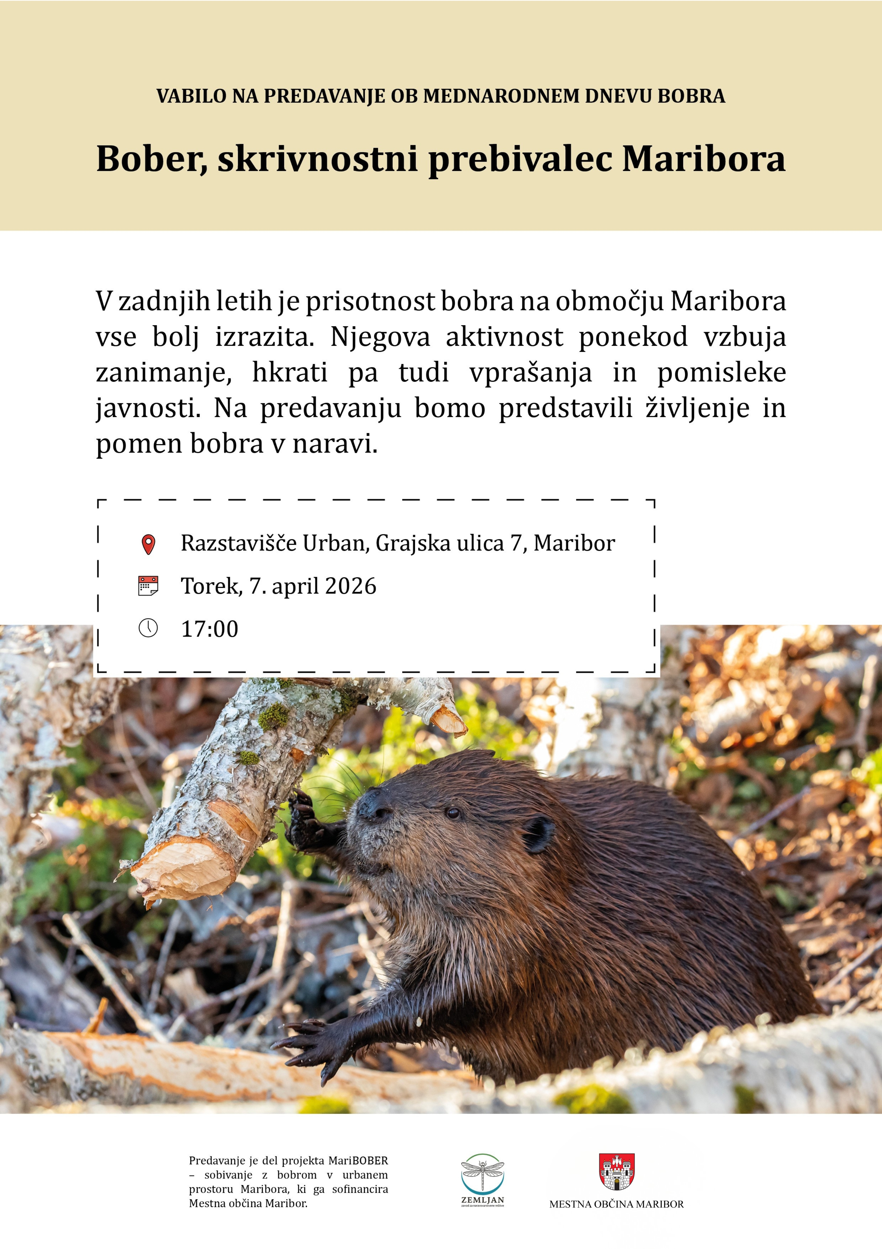Ob mednarodnem dnevu bobra vas vabimo na predavanje zavoda Zemljan o življenju in pomenu bobra v naravi, ki bo dne 7. 4. 2026 ob 17. uri v razstavišču Urban, Grajska ulica 7, Maribor.